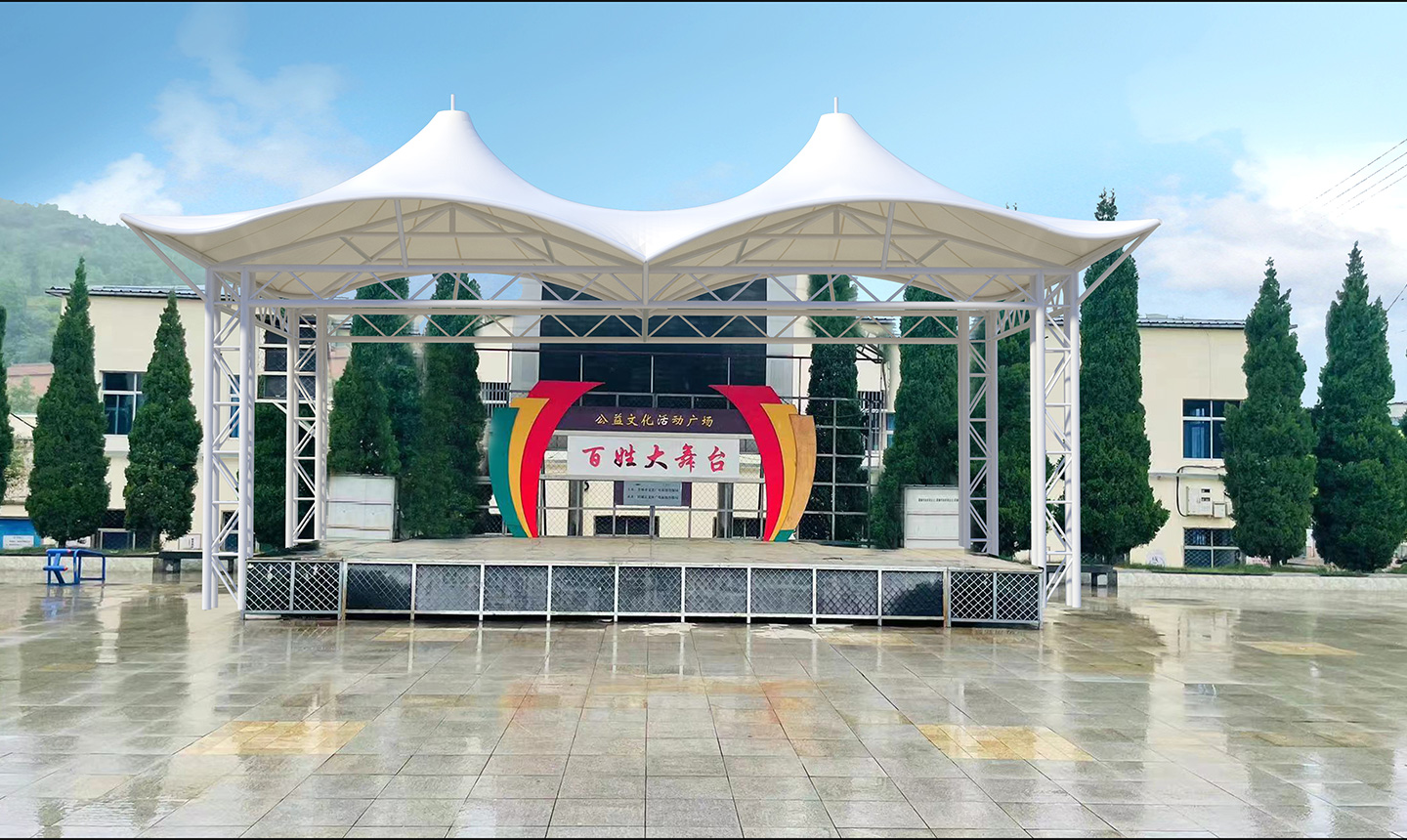 膜結(jié)構(gòu)舞臺最常見的應用場景之一便是戶外音樂節(jié)。由于這些活動往往需要一個既能滿足安全標準又能提供良好視聽效果的臨時舞臺,膜結(jié)構(gòu)舞臺的輕巧、可調(diào)性以及良好的抗風性,使其成為了理想的選擇。例如,在世界各地的搖滾音樂節(jié)、電子音樂節(jié)等活動中,膜結(jié)構(gòu)舞臺常常是標配。
